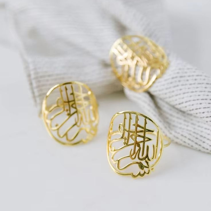 แหวนรองผ้าเช็ดปากทองเหลืองดีไซน์แบบอาหรับเคลือบด้วยทองคำระดับพรีเมียมสำหรับตกแต่งโต๊ะงานแต่งงานที่มีสไตล์และโอกาสตามเทศกาล