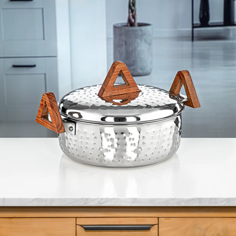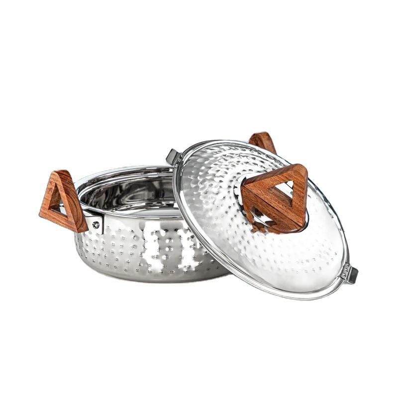 หม้อตุ๋นสีทองสไตล์อาหรับที่เสิร์ฟอาหารทำจากสเตนเลสสตีลและไม้พร้อมที่จับทองเหลืองลายดอกไม้และหม้อร้อน