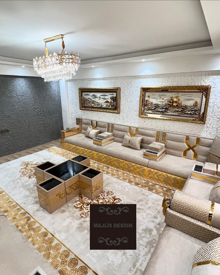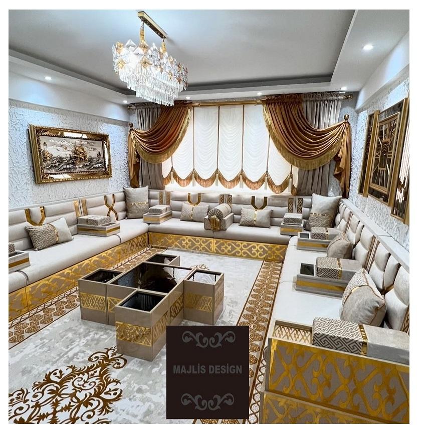 Majlis Arabic ชุดเฟอร์นิเจอร์ห้องรับแขกดีไซน์แบบโมร็อกโก40ซม. ความสูงในการนั่งรวมถึงโซฟาขนสัตว์พรมโต๊ะผ้าม่านบ้านเต็มรูปแบบ