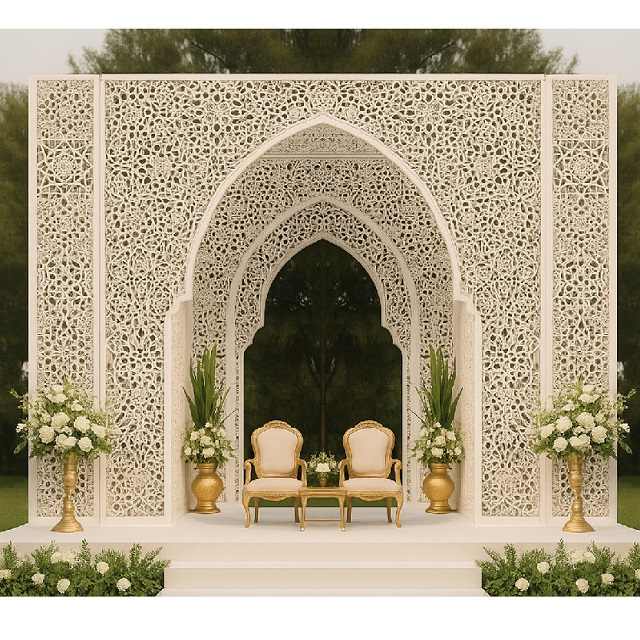 ศาลาแต่งงานแบบตัดเลเซอร์สีขาวสไตล์อาหรับ ซื้อศาลาแต่งงานกลางแจ้งแบบตัดเลเซอร์ที่กำลังเป็นที่นิยม ตกแต่งเวทีขายดีจาก DST Exports สหราชอาณาจักร