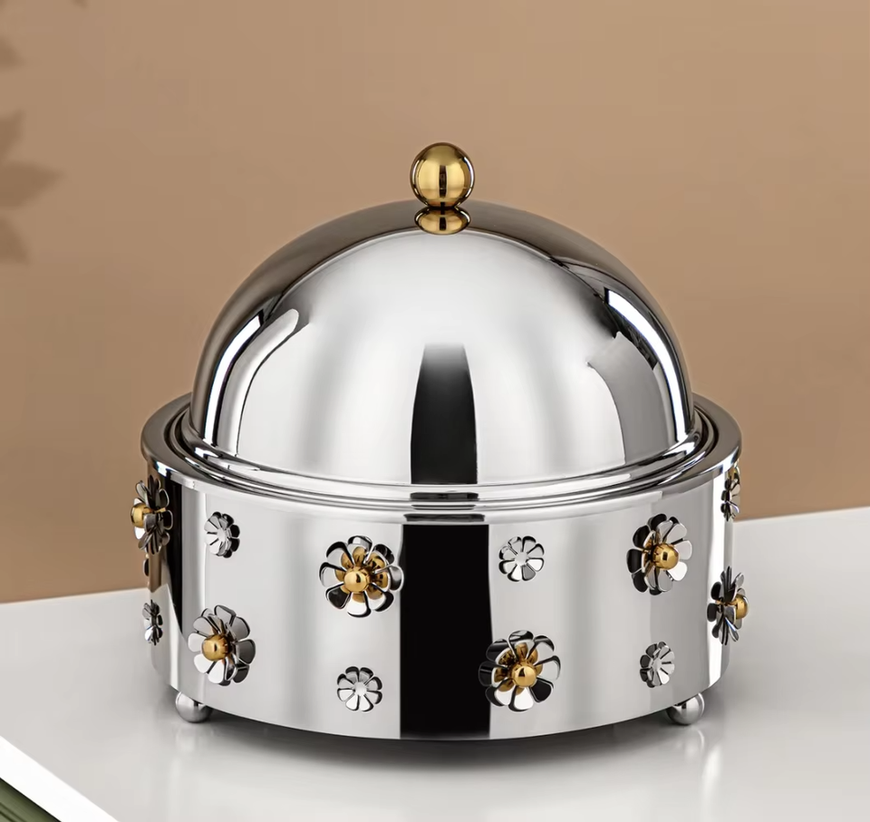 หม้ออุ่นอาหารแบบอาหรับ ทำจากโลหะ สวยงาม เงางาม พร้อมลวดลายดอกไม้ที่แสดงถึงมรดกทางวัฒนธรรมและงานฝีมือ