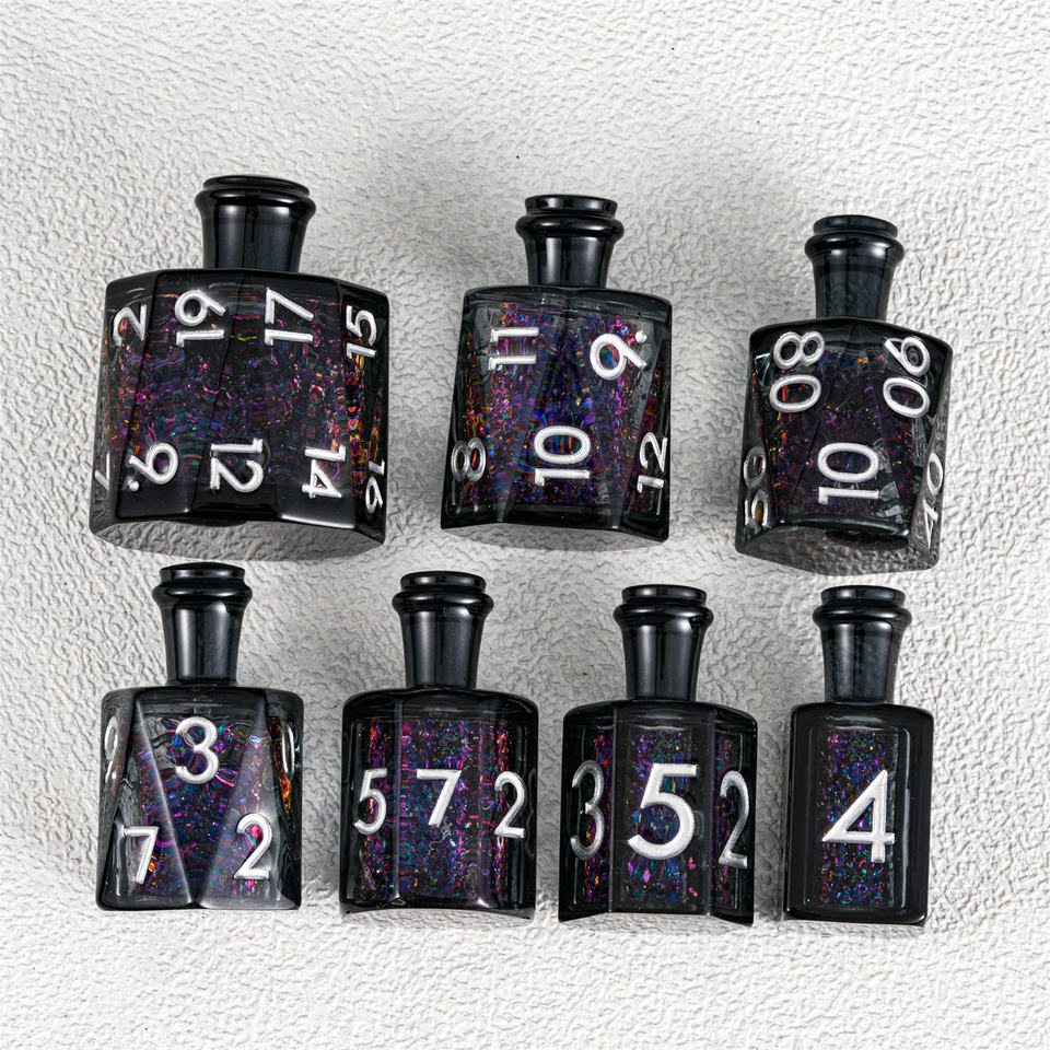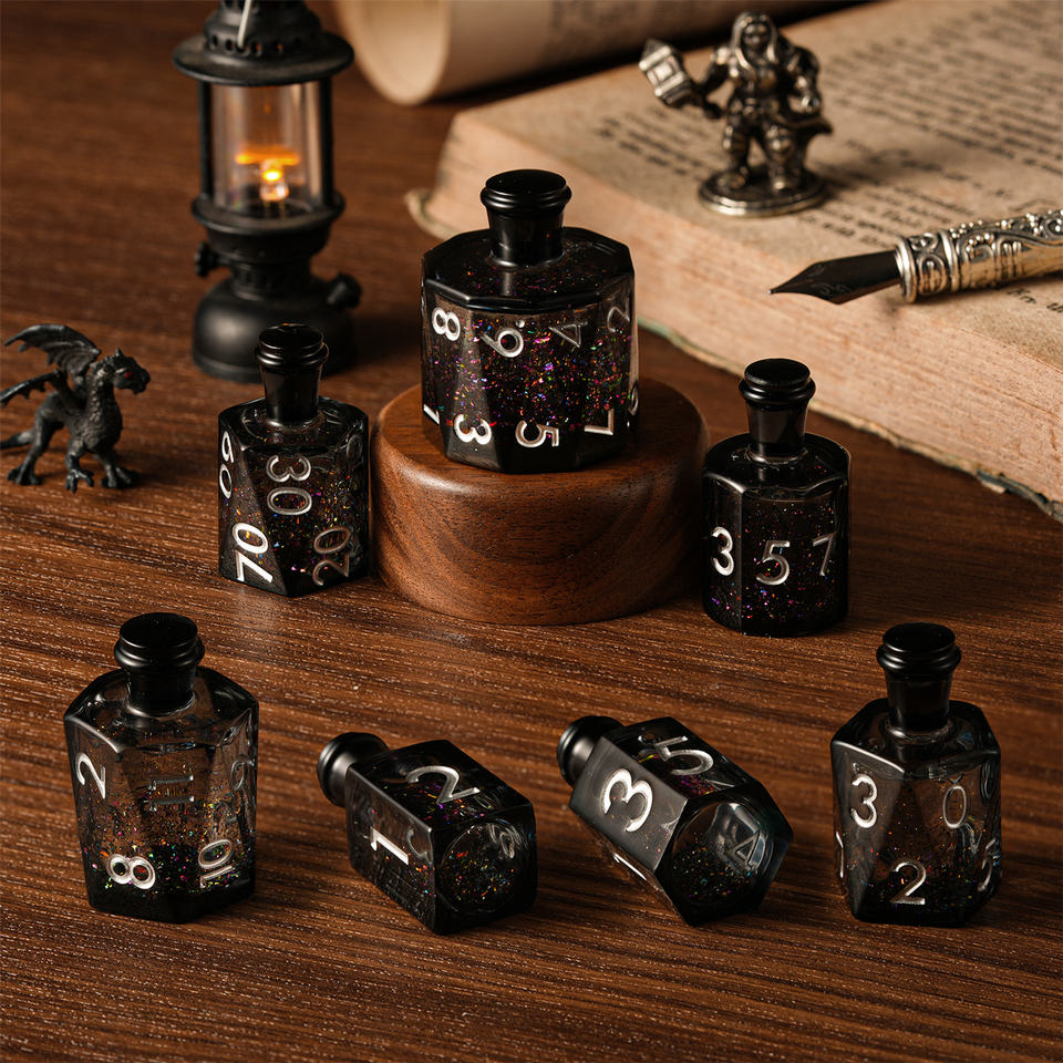ชุดลูกเต๋า Arcane Visionary: ลูกเต๋าแกนเหลวสีดำพร้อมทรายหมุน สำหรับผู้เชี่ยวชาญด้านดันเจี้ยน