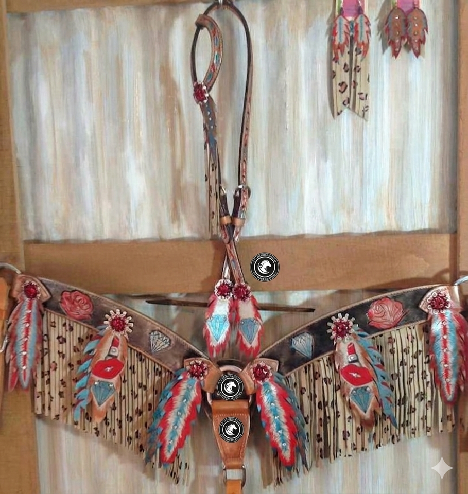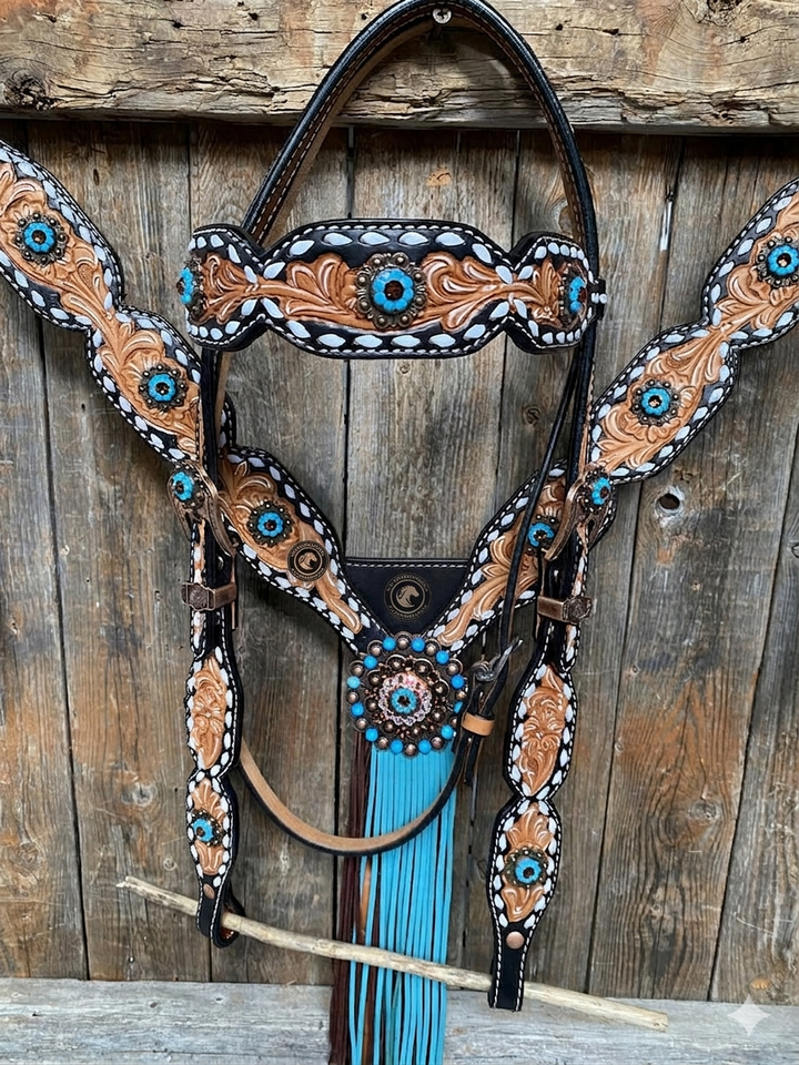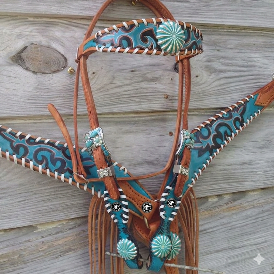 ชุดอุปกรณ์ขี่ม้า Arctic Design สีเขียวอมฟ้า พร้อมพู่ห้อย ประกอบด้วยสายรัดศีรษะและสายรัดอก ทำจากหนังแท้ ทนทาน น้ำหนักเบา ประดับด้วยลูกปัด ออกแบบตามฤดูกาล ปรับแต่งได้