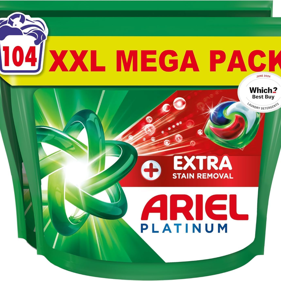 แอเรียลแพลตตินัมพ็อดน้ำยาซักผ้าแบบแคปซูลล้าง104 (52x2) ขจัดคราบพิเศษขจัดคราบสกปรกแห้ง7วัน