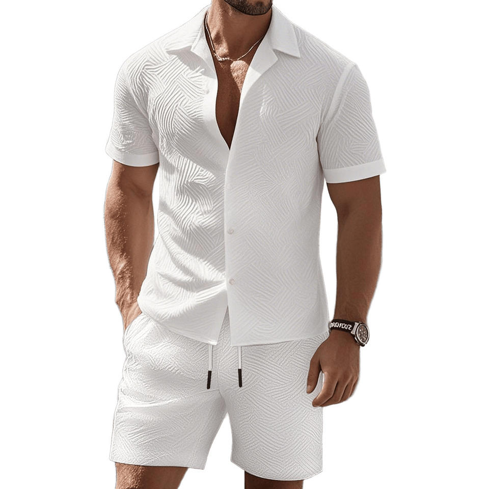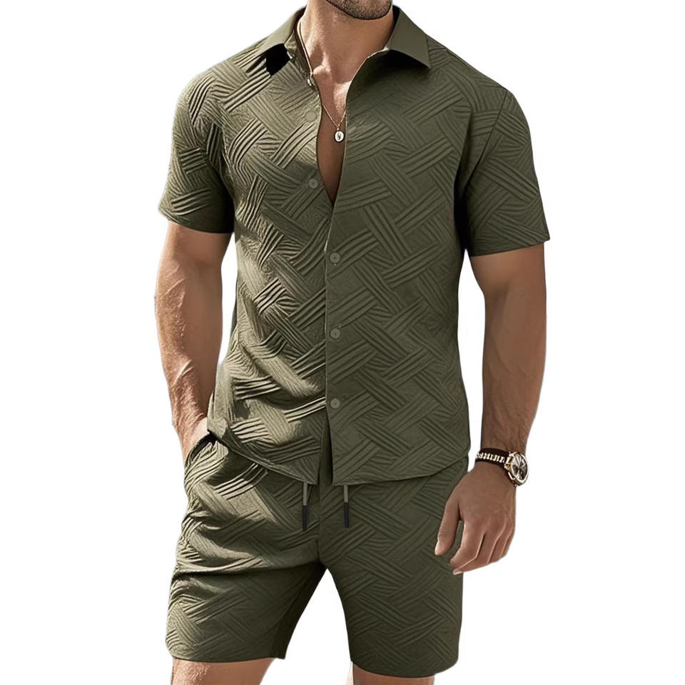 ชุดเสื้อเชิ้ตและกางเกงขาสั้นผ้าแจ็คการ์ดสีเขียวขี้ม้าสำหรับผู้ชาย ชุดลำลองสองชิ้นสำหรับฤดูร้อน ชุดพักผ่อน
