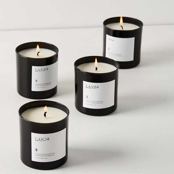เทียนหอมอโรมาเธอราพี ออร์แกนิค ธรรมชาติ ดีไซน์ LANJO ฉลากพิมพ์ลาย ขวดแก้วสีดำด้าน ทำมือ กลิ่นหอมหรูหรา บรรจุในกล่องของขวัญสำหรับเทศกาล