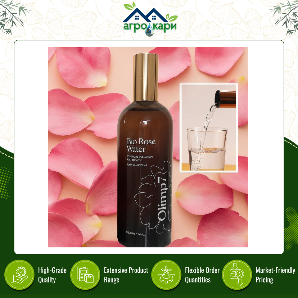น้ำกุหลาบออร์แกนิคบริสุทธิ์ 100% กลิ่นหอมดอกไม้คุณภาพสูง ผลิตจากใบกุหลาบดามัสกีน่า ได้รับการรับรองมาตรฐาน ISO บรรจุขวดแก้ว