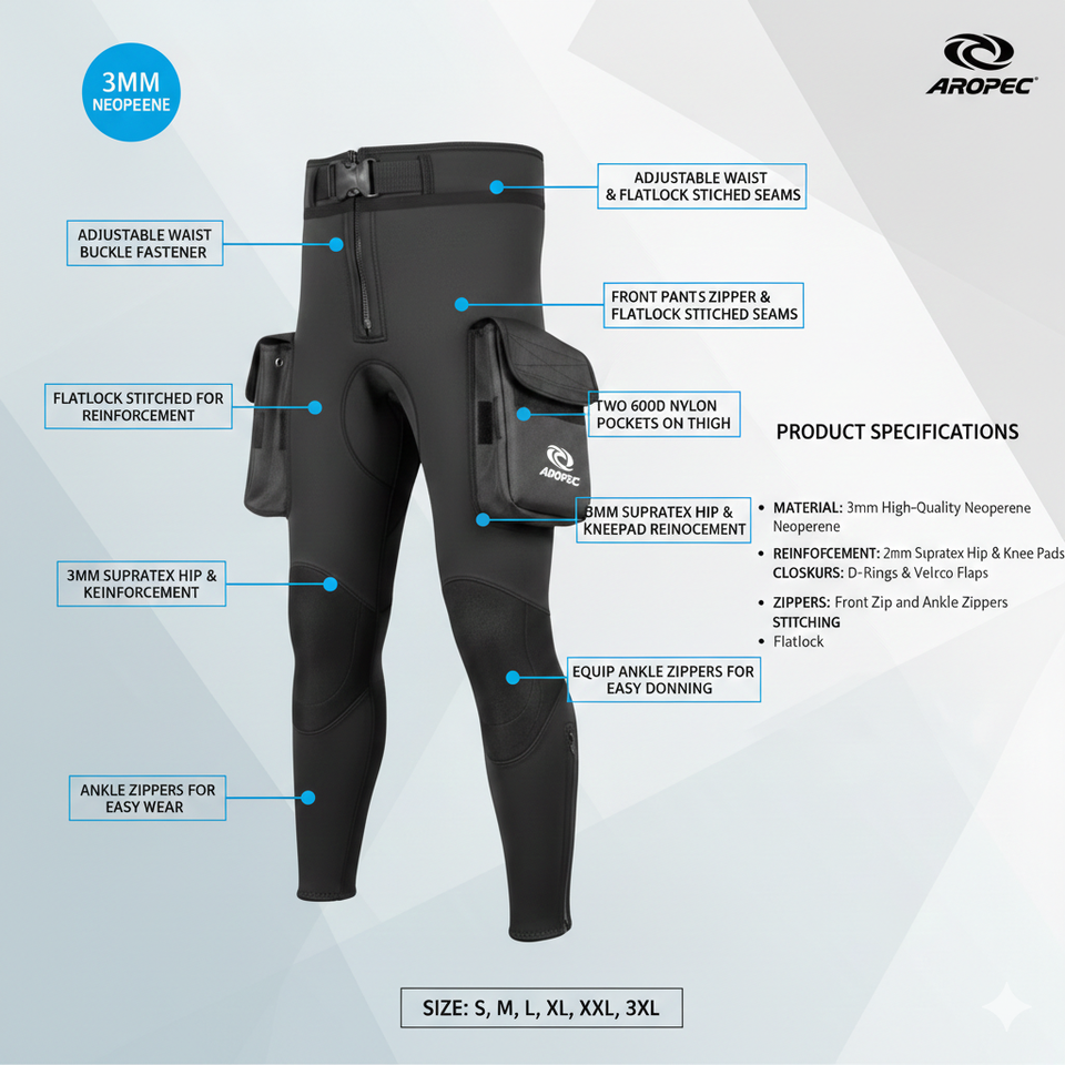 กางเกงเว็ทสูทนีโอพรีน 3 มม. สำหรับผู้ใหญ่ยี่ห้อ Aropec พร้อมกระเป๋า สำหรับดำน้ำตื้น กีฬาทางน้ำ ครูสอนดำน้ำ ครูสอนดำน้ำลึก รับผลิตแบบ OEM/ODM ตามสั่ง
