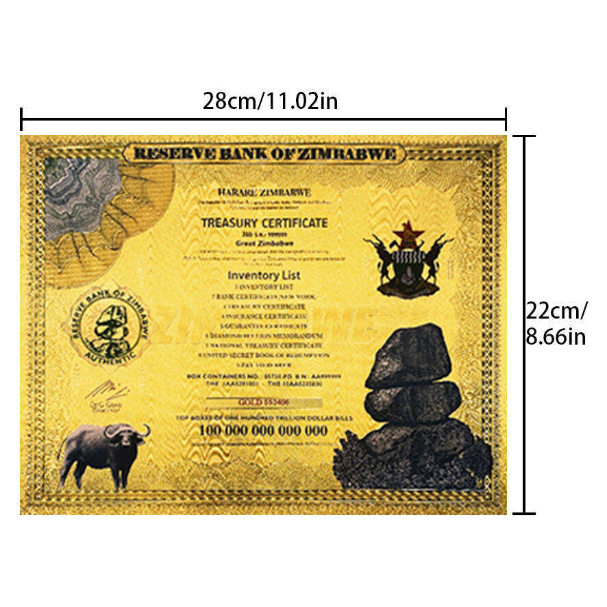 ชุดสะสมงานศิลปะ หมายเลขซีเรียล ธนบัตรหนึ่งร้อยล้านล้านดอลลาร์ซิมบับเว แผ่นพลาสติกเคลือบทองคำ ใบรับรอง