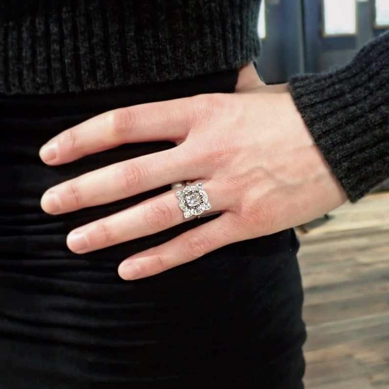 แหวนหมั้นเพชรลายฉลุสไตล์อาร์ตเดโค ประดับเพชรทรงคุชชั่นที่เพาะเลี้ยงในห้องปฏิบัติการ ดีไซน์ลายดอกไม้สไตล์วินเทจ ฝังแบบเบเซล