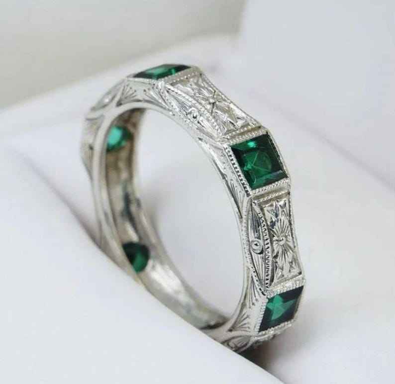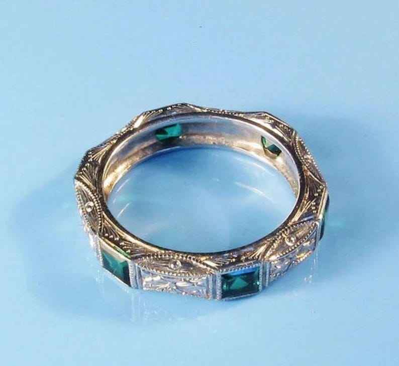 แหวนแถวโมอิสซาไนต์ทรงเอเมอรัลด์คัทสีเขียวสไตล์อาร์ตเดโค