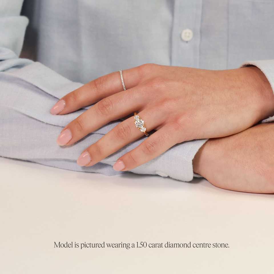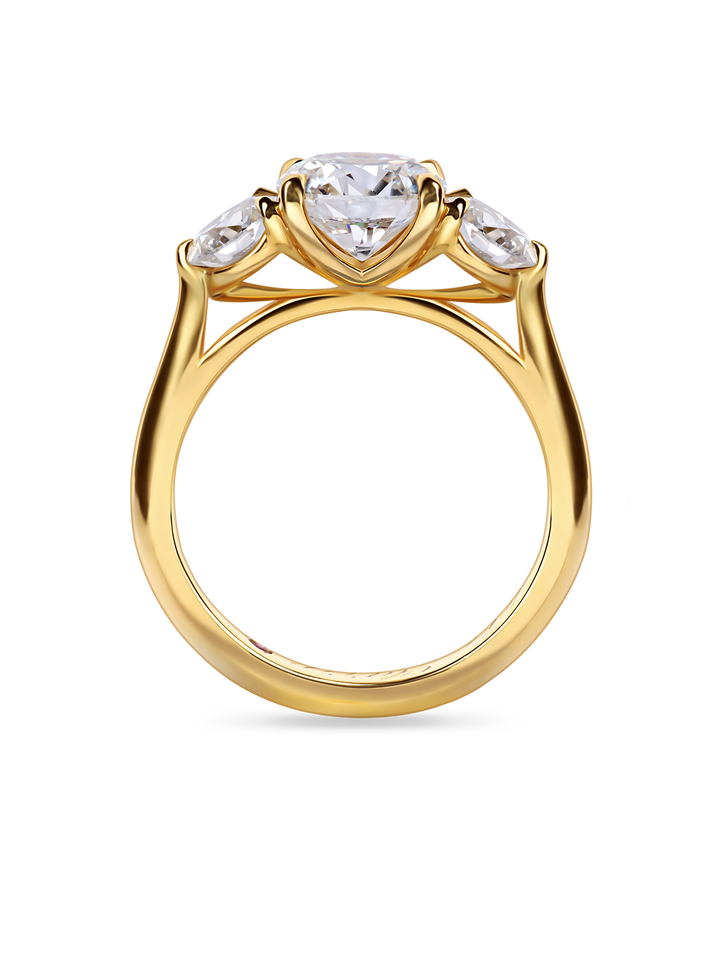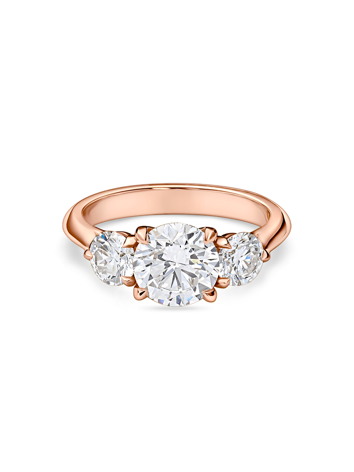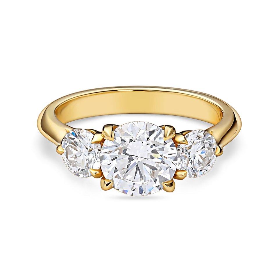 แหวนหมั้นทรงกลมสไตล์อาร์ตเดโค ประดับเพชรแล็บโกรว์ 1+ กะรัต และเพชรทรงบาแกตต์ด้านข้าง ทำจากทองคำขาว 18K สีเหลือง ขาว และโรสโกลด์ รวมถึงทองคำขาวและแพลตตินัม