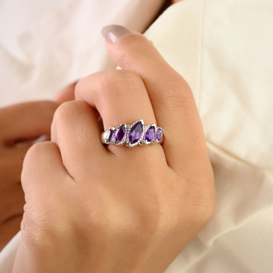 แหวนเงินแท้ S925 ประดับพลอยอะเมทิสต์แท้ 100% ทรงมาร์คีส์ 5 เม็ด ดีไซน์อาร์ตเดโค สวยทันสมัย