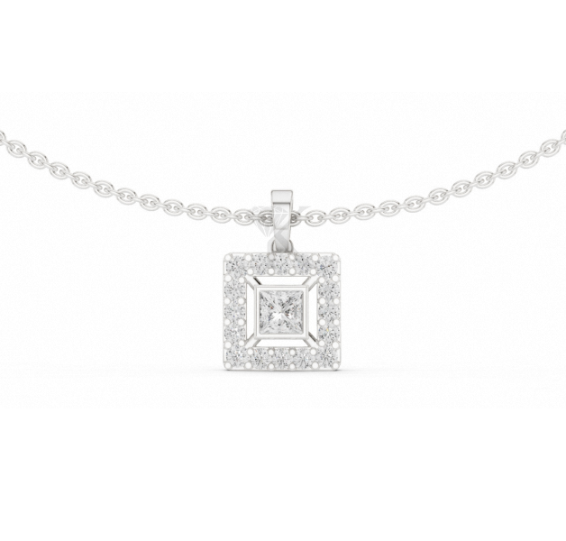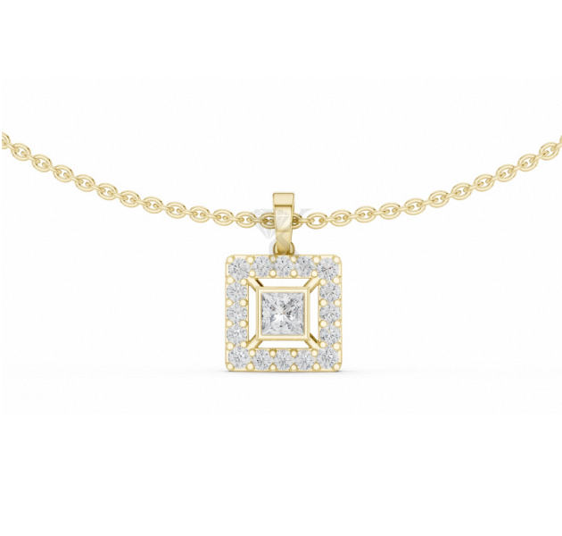 จี้เพชรทรงเจ้าหญิงอาร์ตเดโค ผลิตในห้องปฏิบัติการ รับรองโดย IGI ตัวเรือนทองคำแท้ ดีไซน์เรขาคณิต สร้อยคอทรงเจ้าหญิง ประดับเพชรแบบฮาโล เครื่องประดับชั้นดี