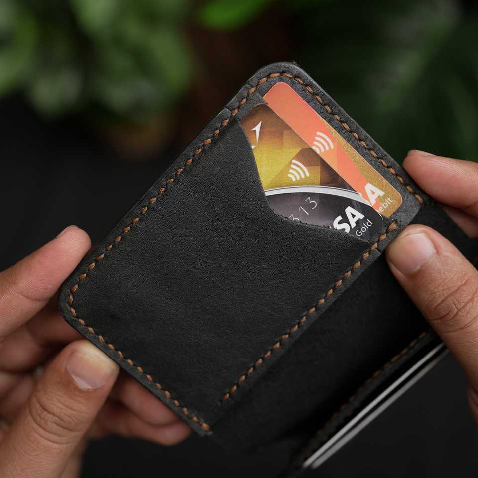 กระเป๋าสตางค์หนังแท้แบบพับสองตอนสำหรับผู้ชาย สีดำ ตะเข็บสีน้ำตาล รับประกัน 5 ปี ลายนูน รุ่น Article 69