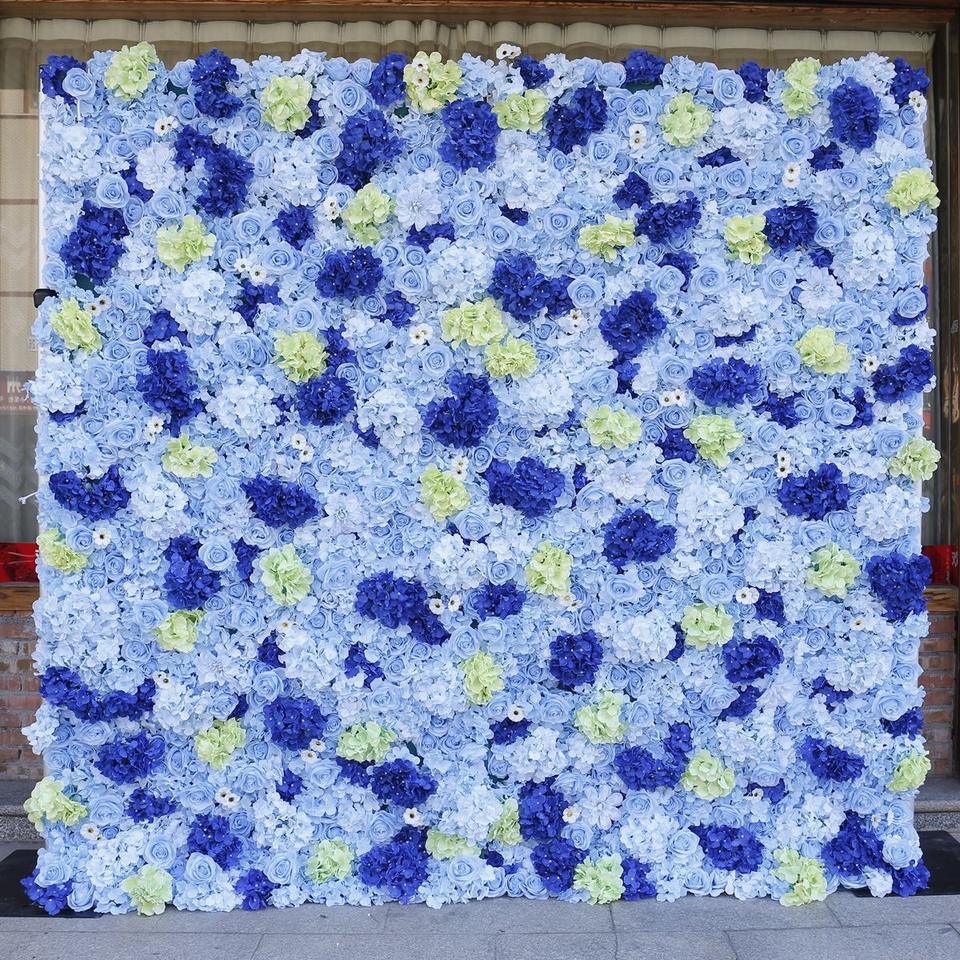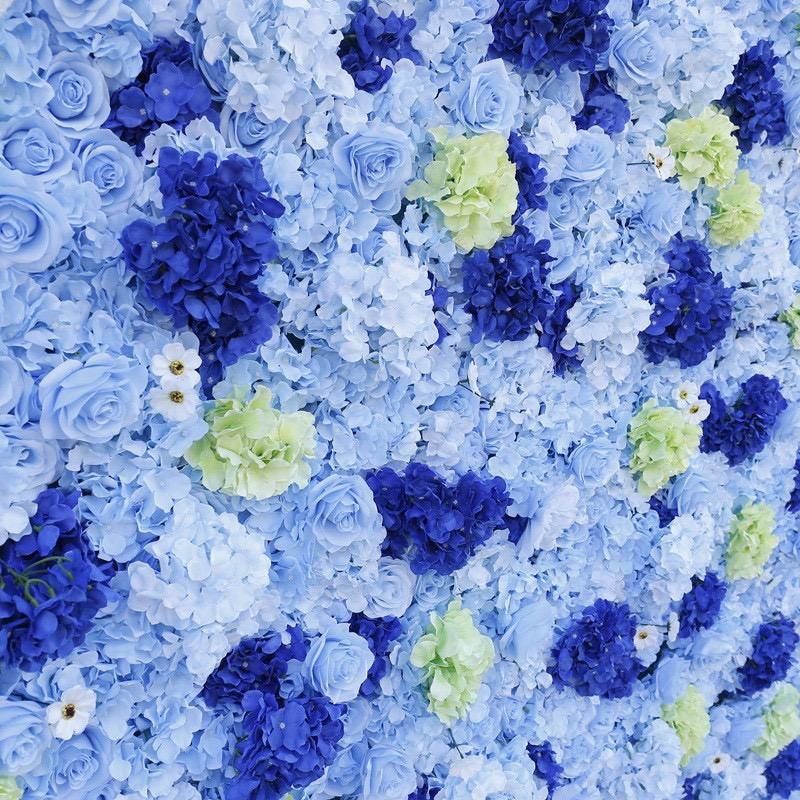 ผนังดอกไม้ประดิษฐ์ 5 มิติ สีฟ้า แผงผนังดอกไม้ประดิษฐ์แบบม้วนเก็บได้ ขนาด 8 ฟุต x 8 ฟุต สำหรับตกแต่งงานแต่งงาน