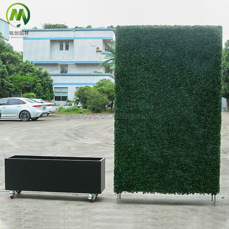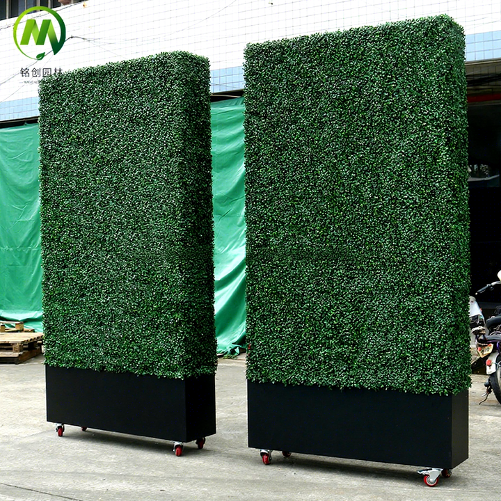 รั้วต้นไม้ประดิษฐ์จากใบไม้บ็อกซ์วูด, ผนังต้นไม้หญ้าเทียมสำหรับภายนอกอาคารพร้อมล้อเลื่อน, แผงผนังรั้วหญ้าเทียม