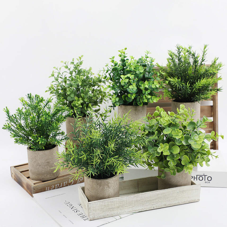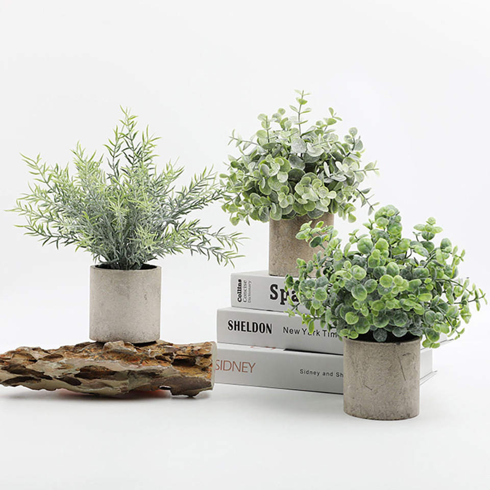 ต้นยูคาลิปตัสและโรสแมรี่ประดิษฐ์ วัสดุ PU กระถางทรงกระบอก สำหรับตกแต่งโต๊ะประชุม บ้าน และสวน ทนรังสียูวี