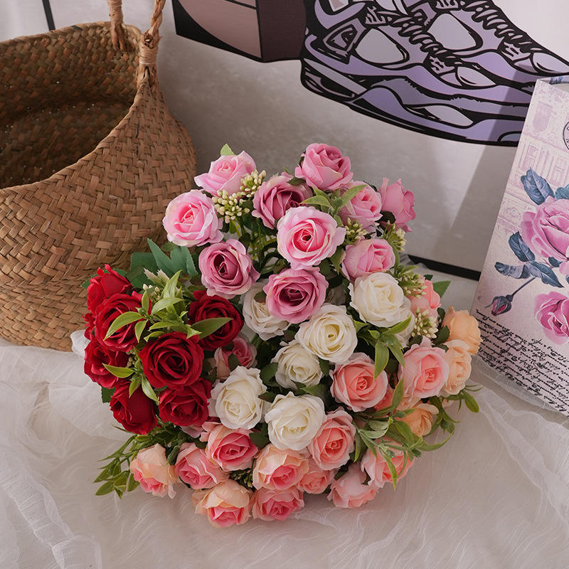 ดอกกุหลาบประดิษฐ์ช่อดอกไม้ทำจากผ้าไหมสำหรับงานแต่งงานเจ้าสาวพิธีแต่งงาน