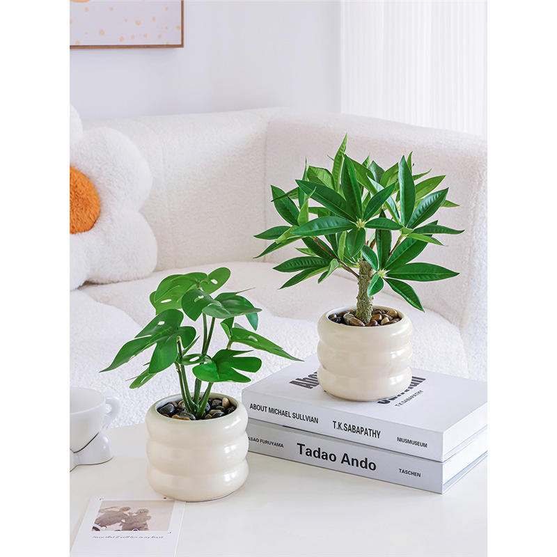 ต้นไม้ประดิษฐ์สีเขียวในกระถางเซรามิก ต้นไม้เงิน ต้นไม้ตกแต่งโต๊ะทำงานในร่ม ใบไม้เสมือนจริง แพ็คหลายชิ้น