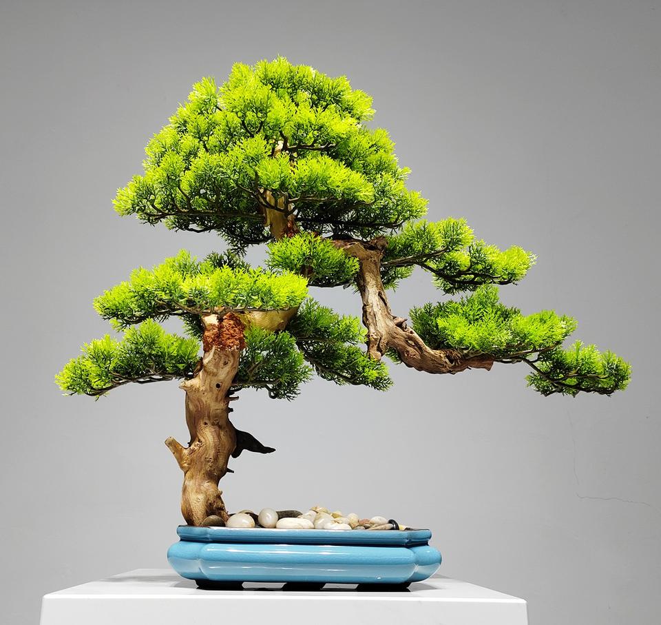 ต้นสนเทียมต้อนรับต้นไม้ปลอมสำหรับห้องนั่งเล่นพืชสีเขียวหน้าผาไซเปรสระเบียงบอนไซตกแต่งสำนักงานตกแต่งโรงแรม