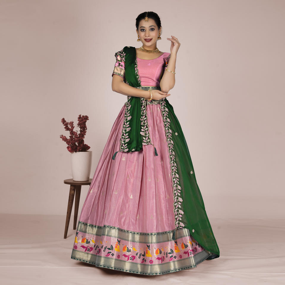 ชุดเลเฮนกาโชลีผ้าไหมบานาราซีงานฝีมือประณีต พร้อมขอบผ้าทอลวดลายสีสันสดใส และผ้าคลุมไหล่ทรงสวยสง่าสำหรับงานแต่งงาน