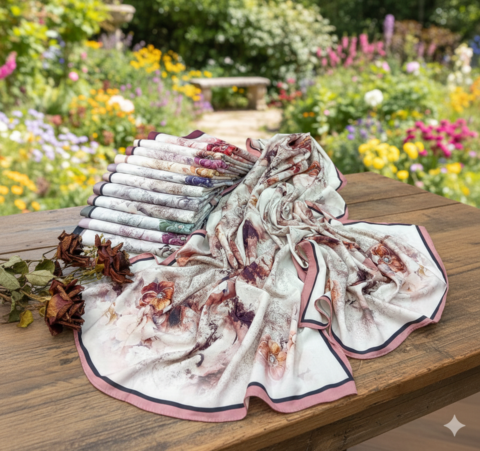 ผ้าพันคอผ้าซาตินลายดอกไม้พิมพ์ลายแบบอาร์ติซาน หรูหรา น้ำหนักเบา ใช้ได้ทุกฤดู คอลเลคชั่นผ้าโพกศีรษะ ลายกุหลาบอันละเอียดอ่อน ตกแต่งด้วยมือ