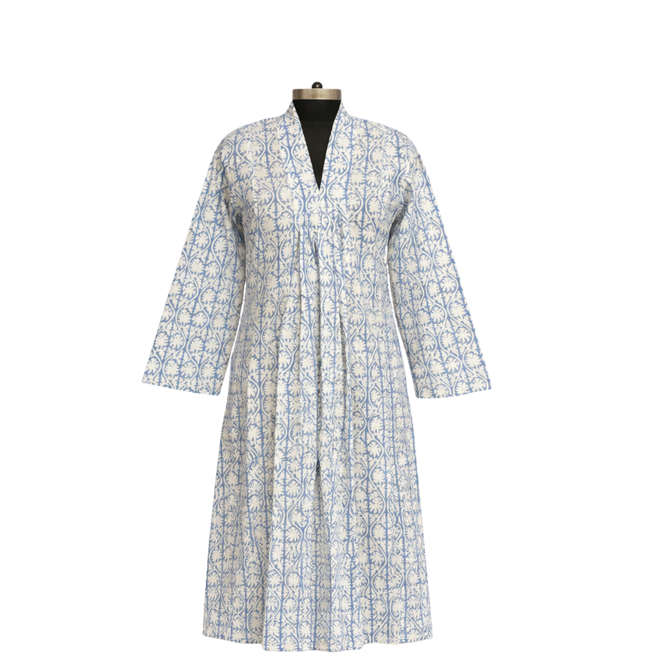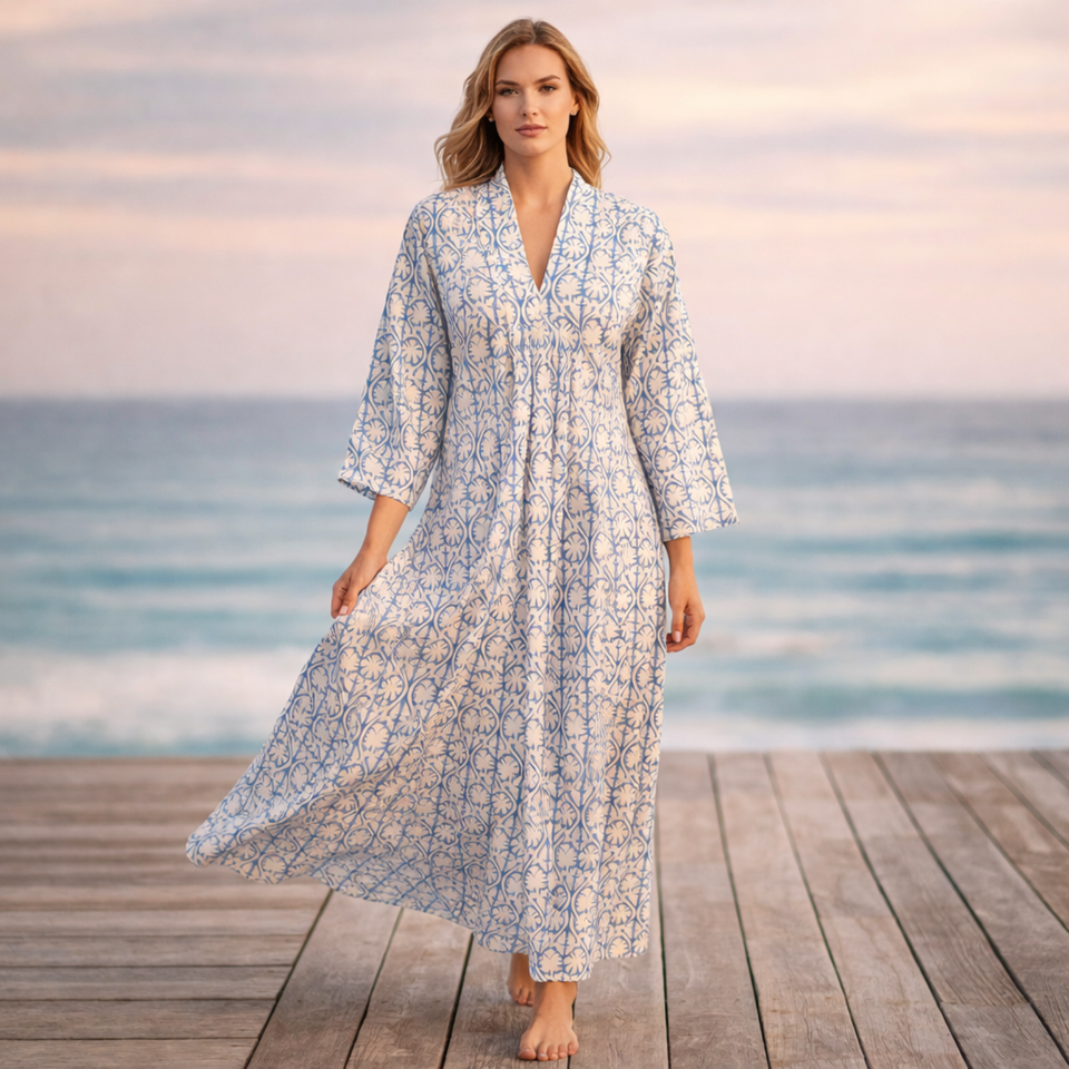 ชุดเดรสผ้าฝ้ายพิมพ์ลายบล็อกทำมือ คอวี แขนยาว ทรงเข้ารูป มีกระเป๋าข้าง สำหรับผู้หญิง ชุดเดรสยาวหรูหรา