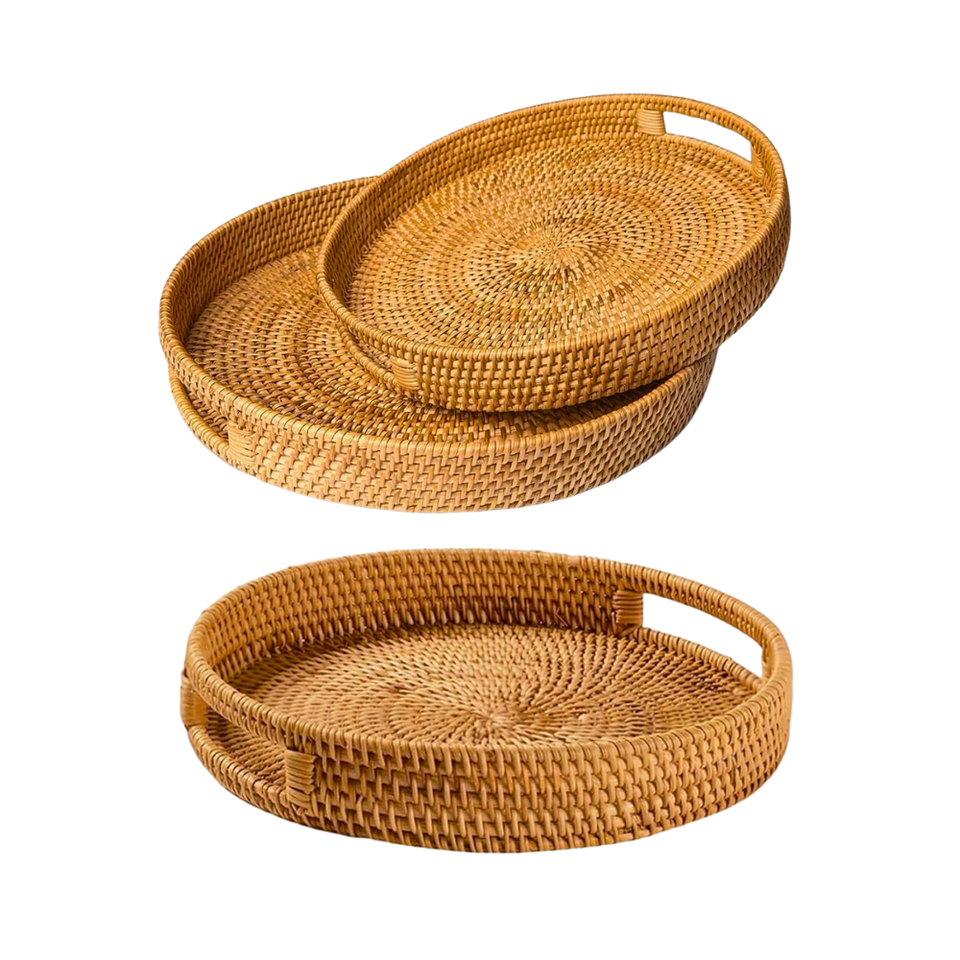 ตะกร้าหวายสานทรงกลม/ถาดงานฝีมือตะกร้าเป็นมิตรกับสิ่งแวดล้อมสำหรับใช้ในบ้านใช้ในโรงแรมอาหารเช้ากาแฟหรือที่วางโชว์