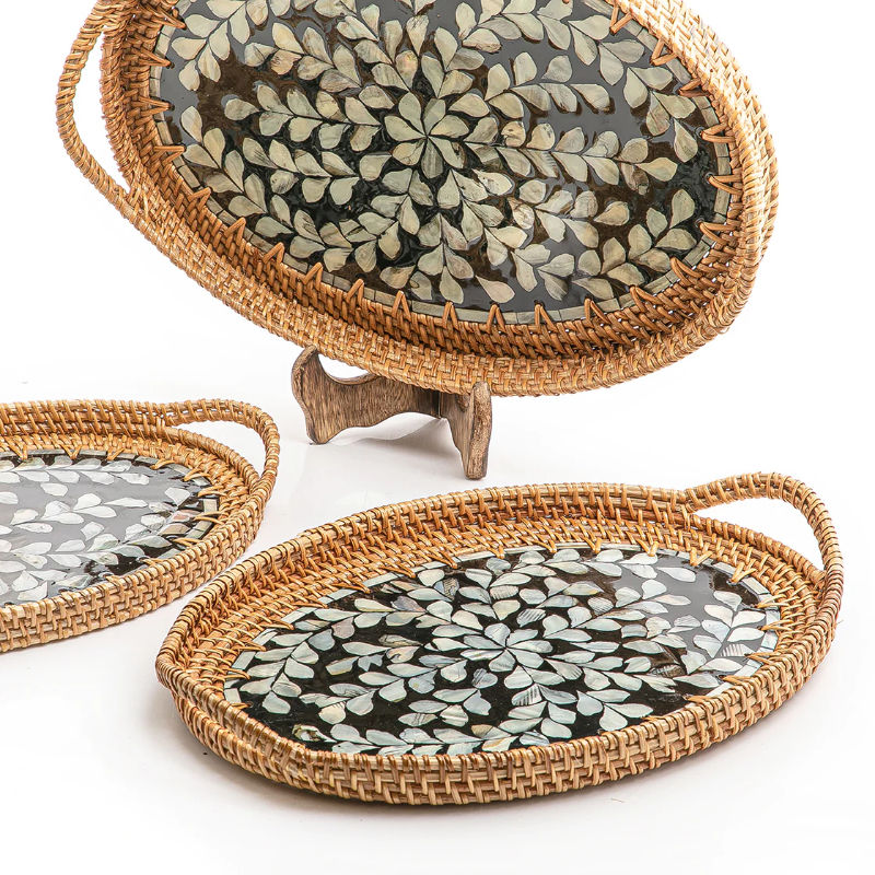 ช่างฝีมือถาดหวายรูปไข่สีดำดีไซน์น่ารักไม่เหมือนใครทันสมัยเหมาะสำหรับเสิร์ฟเครื่องดื่มของว่างและของตกแต่งบ้าน