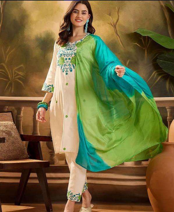 งาน:งานปักด้ายละเอียดบนเสื้อ Kurta, กางเกง และผ้าคลุมไหล่