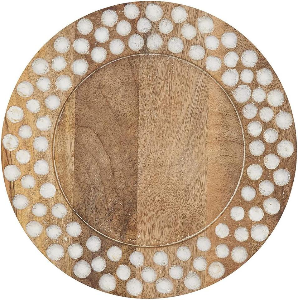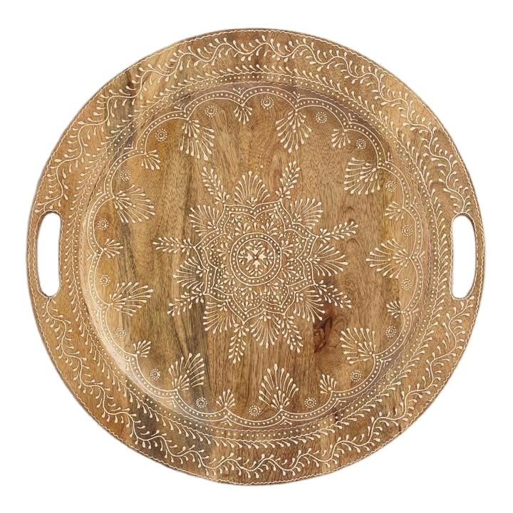 ถาดไม้กลมงานฝีมือ พร้อมลายมันดาลาเพ้นท์มือ และหูจับด้านข้าง ใช้เป็นถาดเสิร์ฟตกแต่งบ้าน สำหรับงานเทศกาล