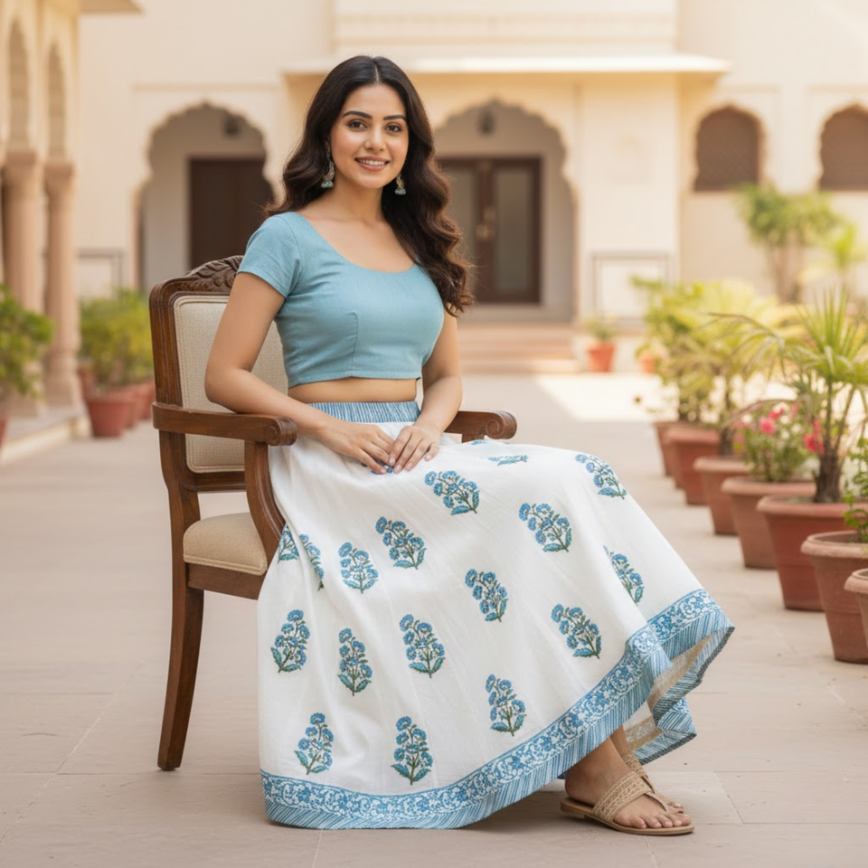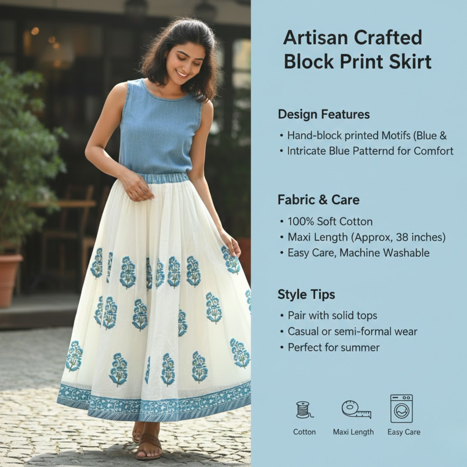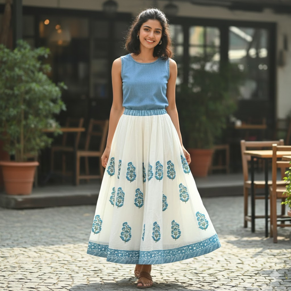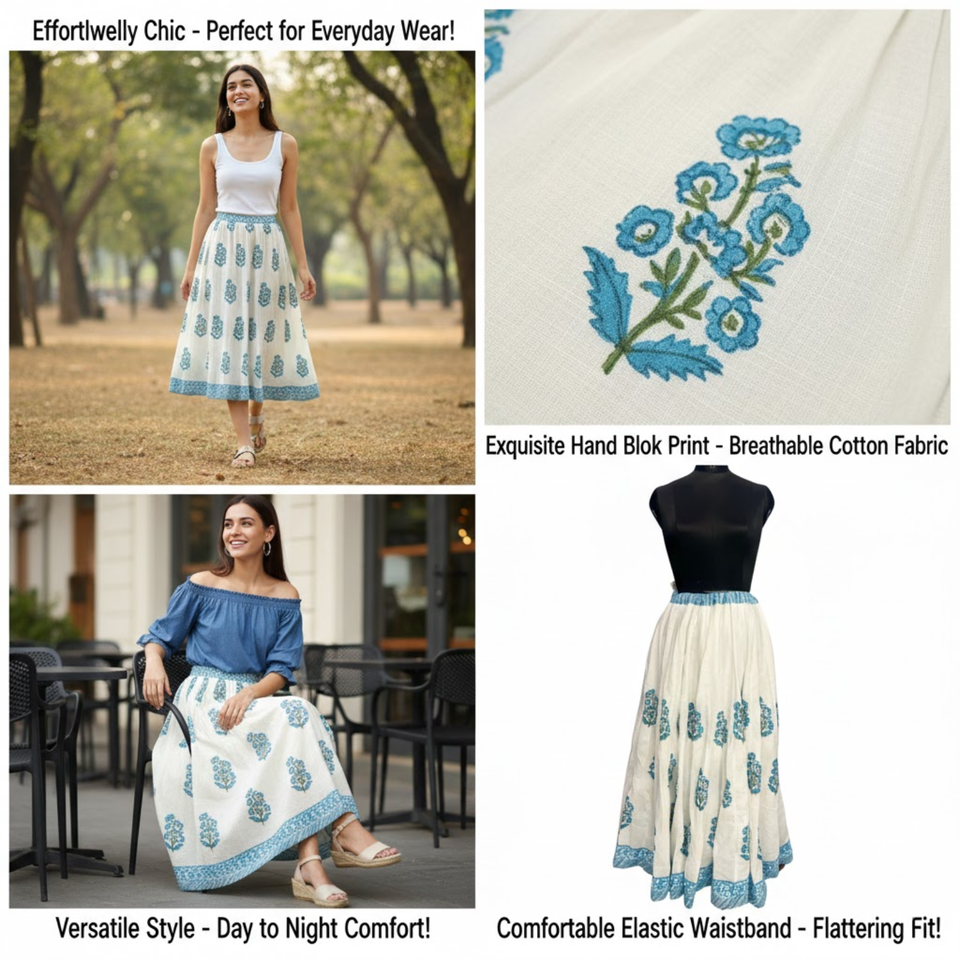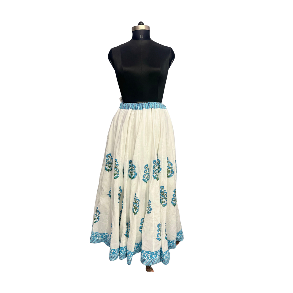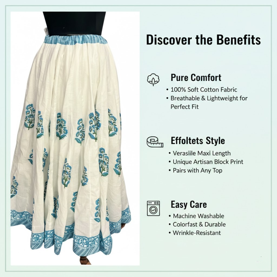 กระโปรงผ้าฝ้าย 36 คามีลี งานฝีมือพิมพ์ลายด้วยมือสำหรับผู้หญิง ทรงบานยาว พร้อมซับในลายดอกแอสเตอร์ แต่งขอบด้วยผ้าตัดเย็บแบบต่างสี ดีไซน์แบบเดรส