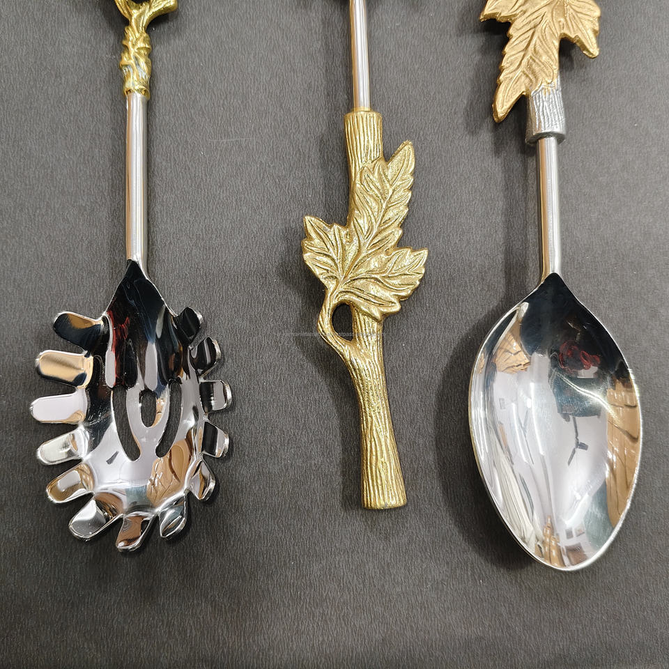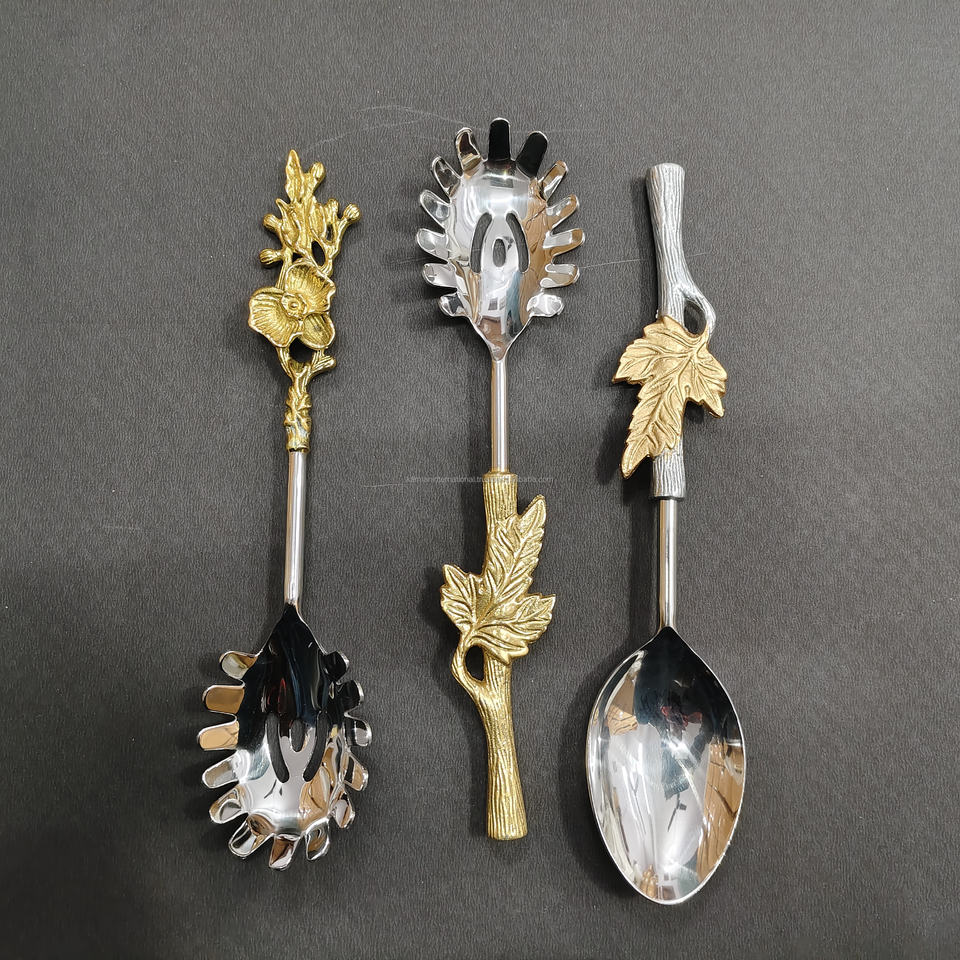 Artisanal 6-Piece Assorted Nature-Inspired Serving Spoon Set Gold-Tone Leaf and Branch Handles Stainless Steel Buffet Utensils