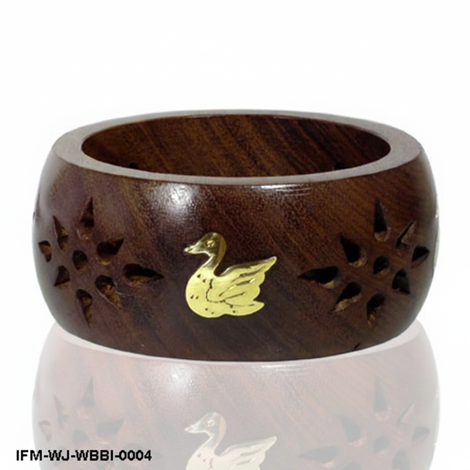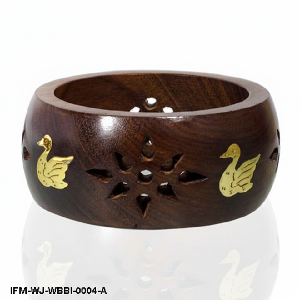กำไลข้อมือไม้สีเข้มสไตล์งานฝีมือประดับด้วยทองเหลืองรูปนกและลวดลายเรขาคณิต สไตล์วินเทจ เครื่องประดับทำมือจากอินเดีย