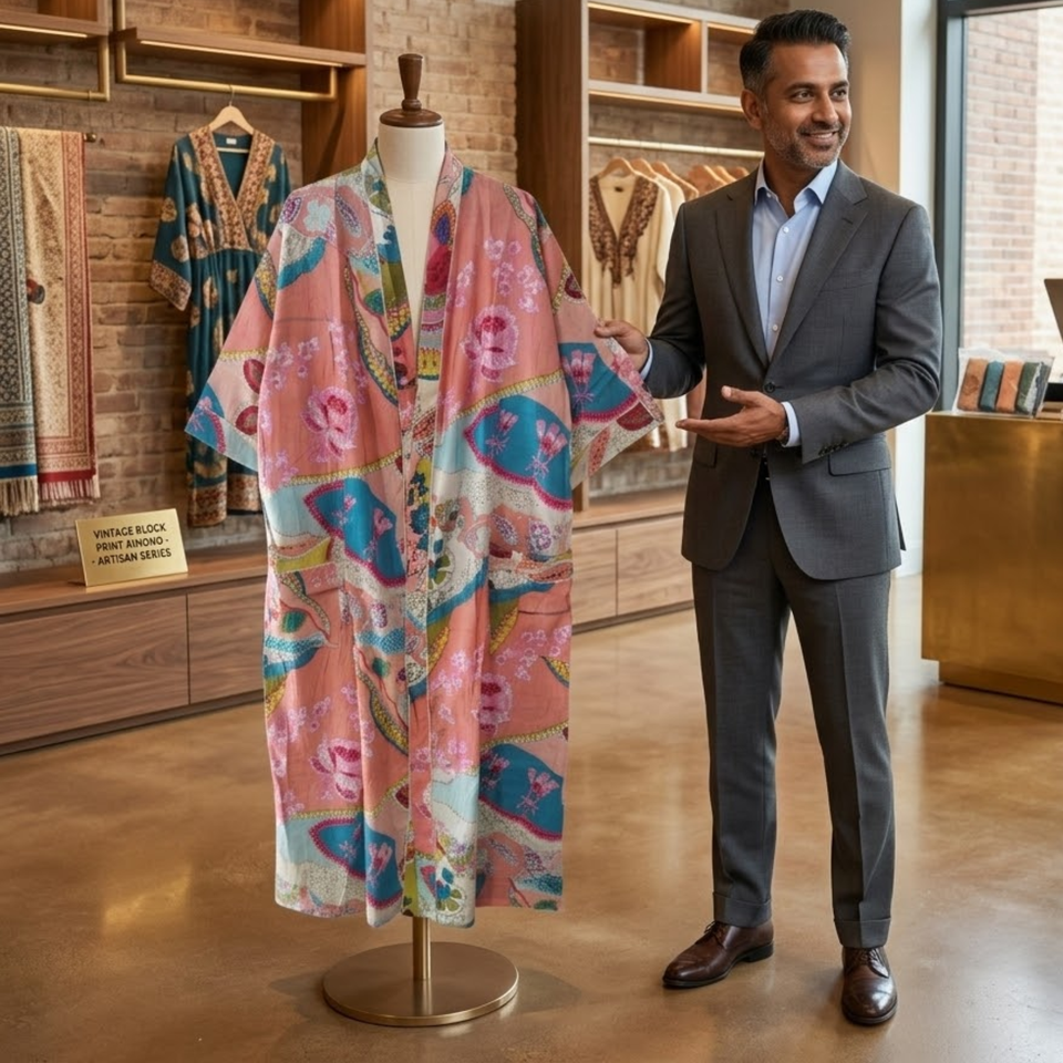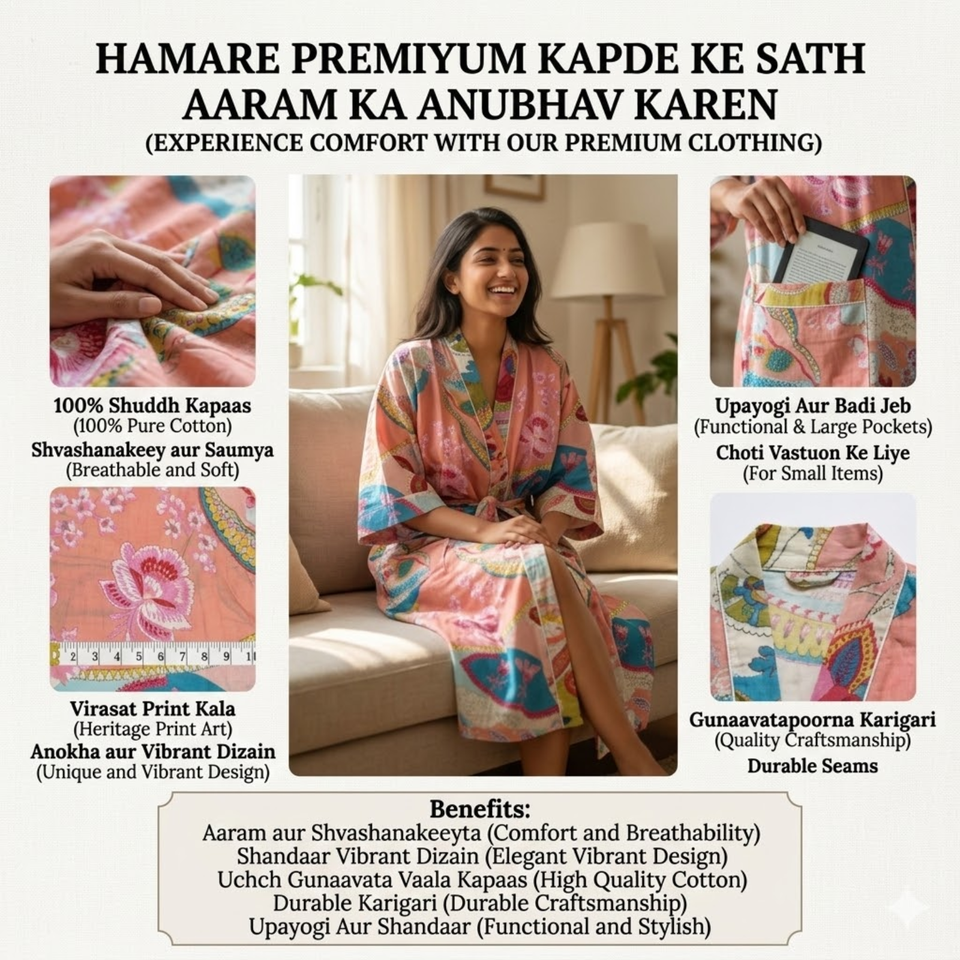 ชุดกิโมโนผ้าฝ้ายลายดอกไม้แบบทำมือ | ชุดคลุมยาวพิมพ์ลายแฮนด์บล็อกสำหรับผู้หญิง | ชุดนอนสปาแขนยาวคอวีแบบบูติก
