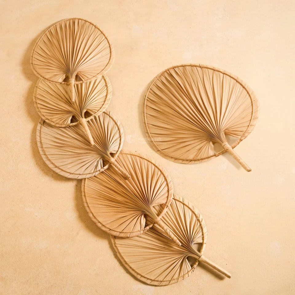 พัดติดผนังใบปาล์มทำมือ งานศิลปะตกแต่งผนังสไตล์ทรอปิคอลที่ยั่งยืน และสไตล์โบฮีเมียนธรรมชาติสำหรับตกแต่งบ้านและงานอีเว้นท์