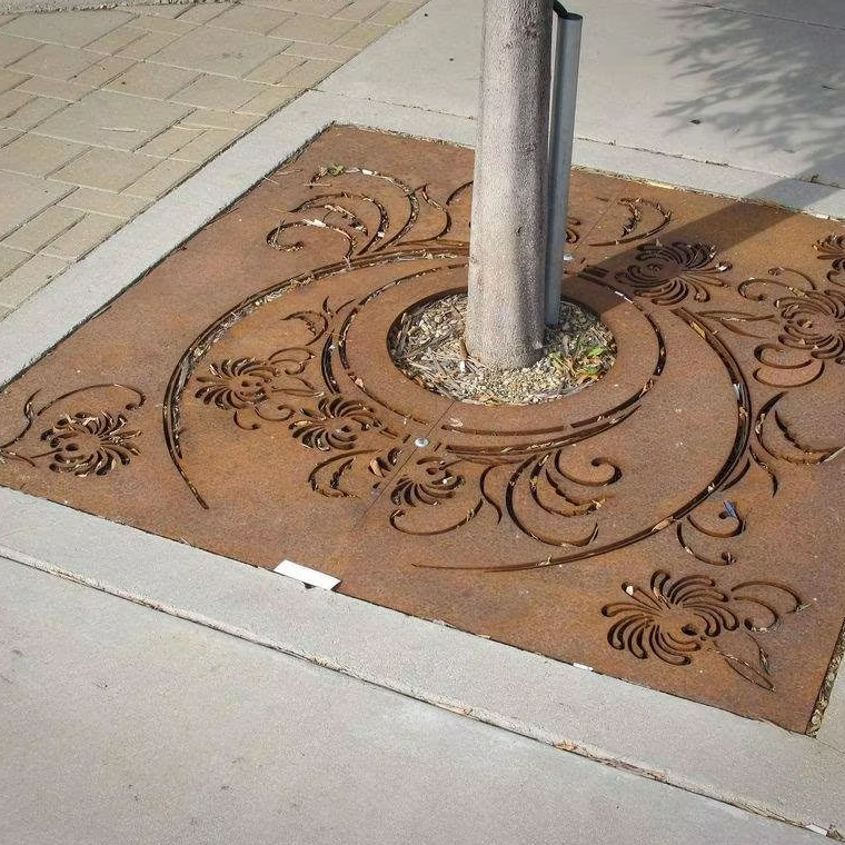 ตะแกรงต้นไม้เหล็กคอร์เทนลายศิลปะอาร์ตเดโค พร้อมลวดลายวน ทนน้ำและทนต่อสภาพอากาศ สำหรับตกแต่งภายนอก