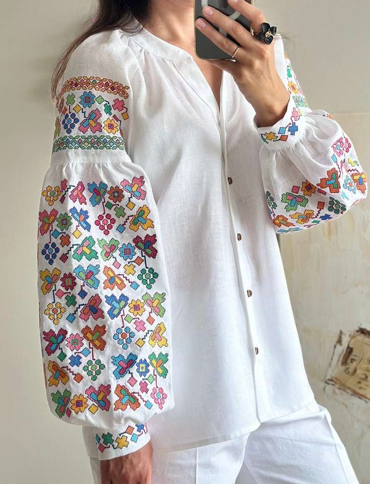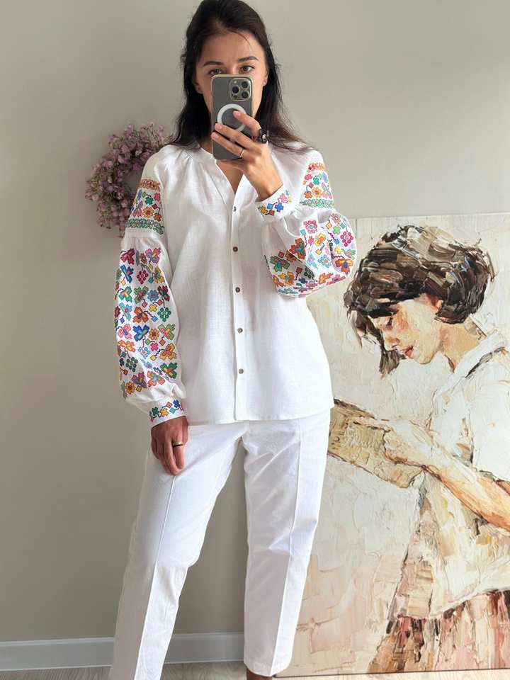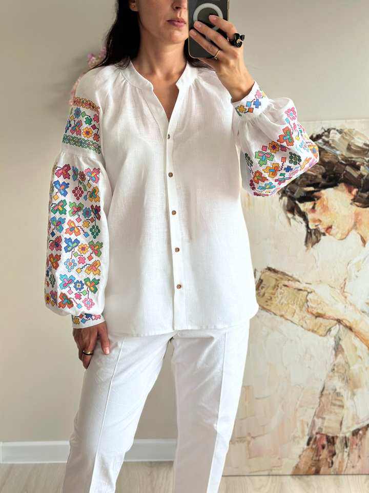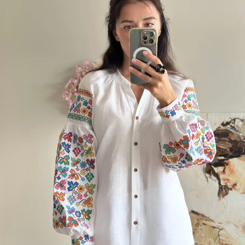 เสื้อเบลาส์งานทำมือสไตล์โบฮีเมียนปักลายดอกไม้ผ้าลินินแท้เสื้อเน้นเอวธรรมชาติ
