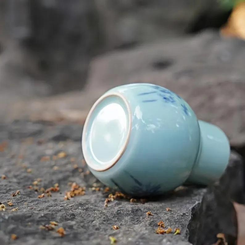 แจกันดอกไม้เซรามิกดีไซน์ศิลปะเคลือบสีฟ้าอ่อน พร้อมลายดอกไม้เพ้นท์มือ ดีไซน์กะทัดรัด เหมาะสำหรับตกแต่งบ้านอย่างมีสไตล์
