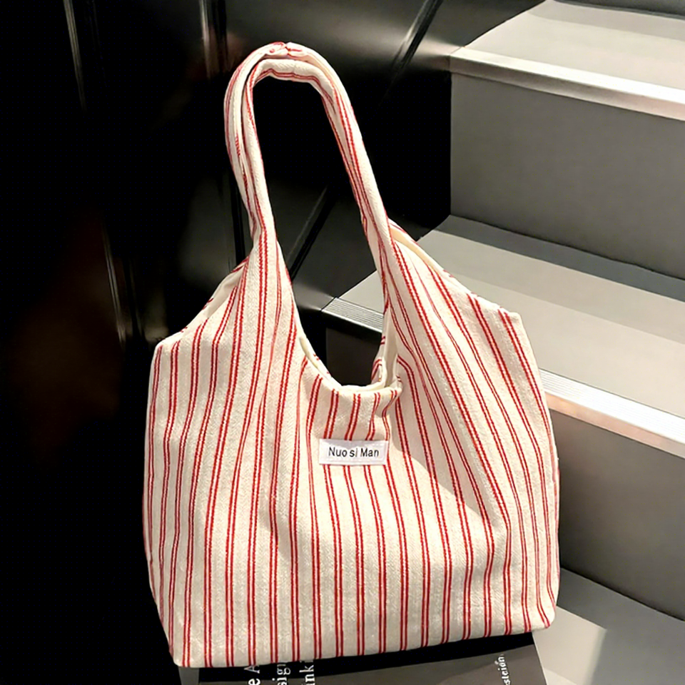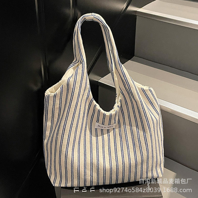 กระเป๋าผ้าแคนวาสสำหรับผู้หญิง, 2025ใหม่ฤดูร้อนกระเป๋าสะพายไหล่ลายทางความจุขนาดใหญ่สำหรับผู้ไปทำงานลำลอง
