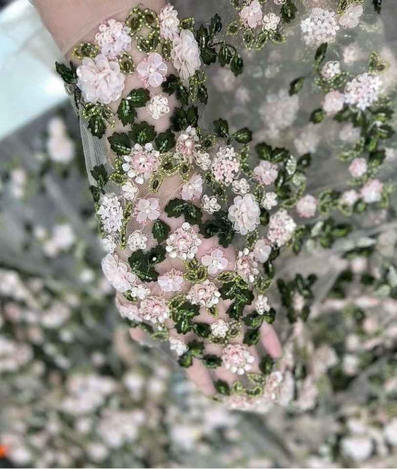 ผ้าลูกไม้โพลีเอสเตอร์ออร์แกนิค 100% ปักด้วยลูกปัดและด้าย สำหรับชุดเลเฮนกาเด็กผู้หญิง ดีไซน์เป็นมิตรกับสิ่งแวดล้อม เหมาะสำหรับงานแต่งงานและงานเลี้ยง