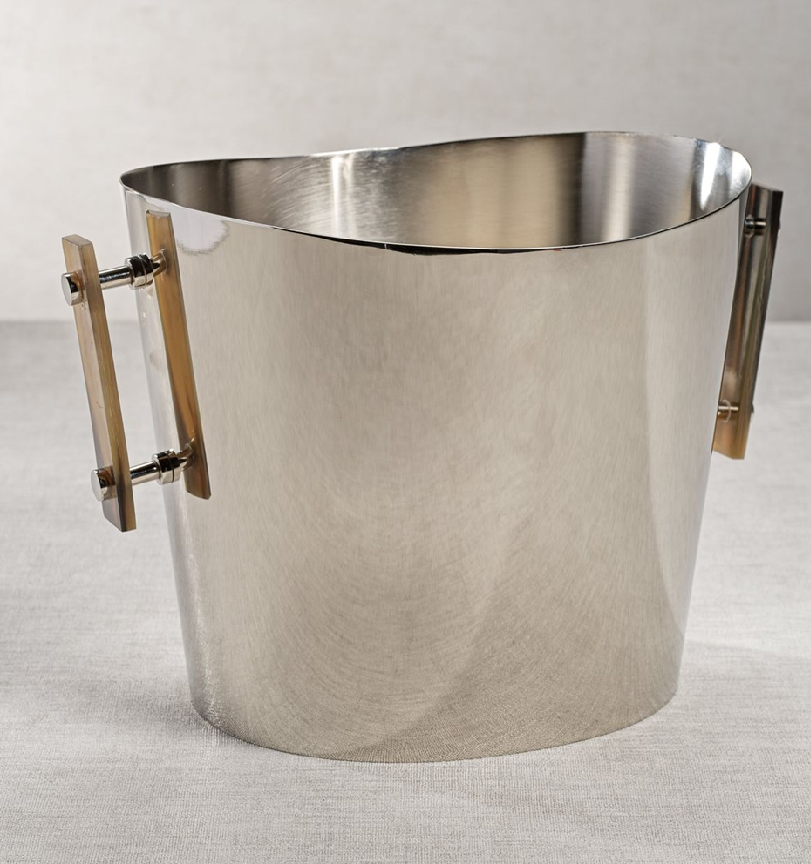 ถังน้ำแข็งโลหะสีเงินแบบศิลปะ พร้อมลวดลายแกะสลักและหูจับแบบเจาะรู มีจำหน่ายในราคาขายส่ง