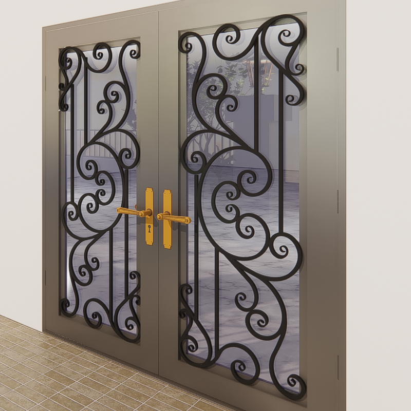 ประตูเหล็กดัดที่มีรายละเอียดสมมาตรและพื้นผิวแบบชนบทสำหรับการยกระดับทางเข้าอาคารที่พักอาศัยที่หรูหรา