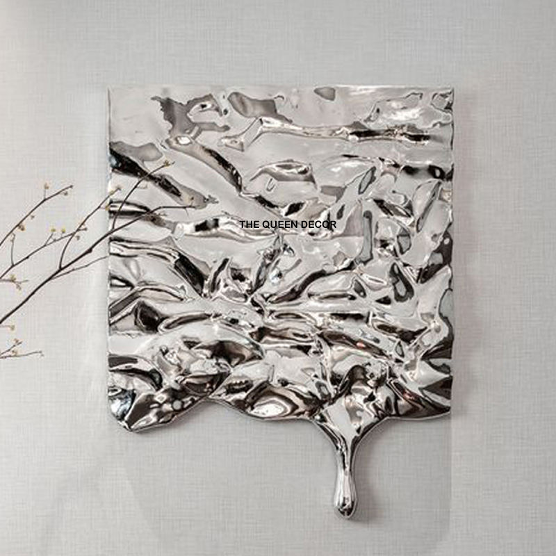 งานศิลปะตกแต่งผนังทำมือ ภาพวาดตกแต่งผนัง 3 มิติ ศิลปะโลหะนามธรรมสีเงินเงา สำหรับตกแต่งผนังห้องนั่งเล่น