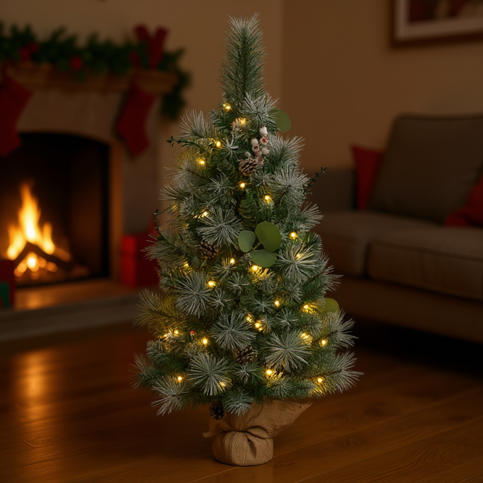 ต้นคริสต์มาสขนาดเล็กประดิษฐ์พร้อมไฟ LED สีขาวอบอุ่น ขนาด 3 ฟุต รุ่นภาพที่ 3 สำหรับตกแต่งบนโต๊ะในร่ม พร้อมลูกสน