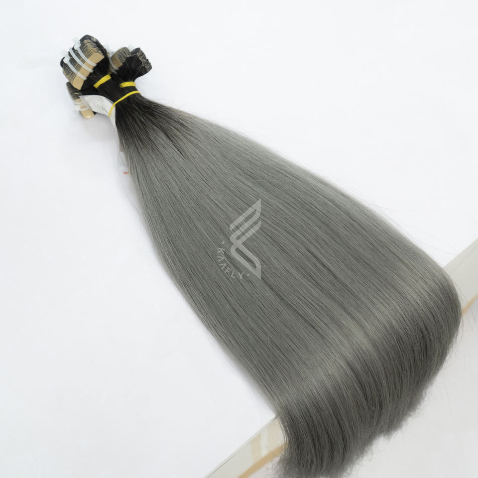 ผมต่อแบบเทปอินสีเทาอมฟูมิ แบบเวอร์จิ้นเรมี่ ผมแท้ยุโรป ทอสองชั้น ย้อมสี ขายส่ง