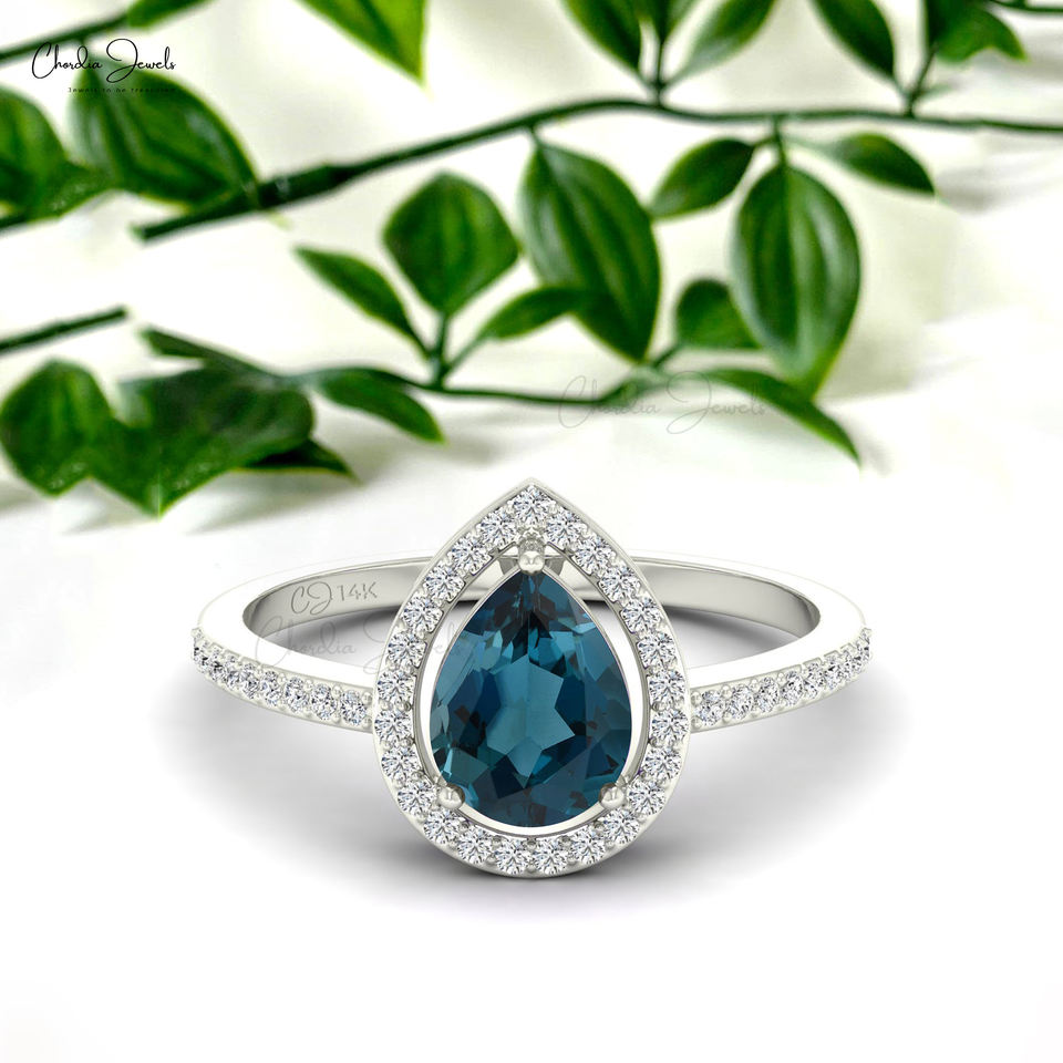 แหวนเพชรฮาโลเจน1มม. ได้รับการรับรองจากผู้ผลิตเอเชียกับ8x6มม. ทรงหยดน้ำตาลอนดอนบลูโทแพซทอง14K เครื่องประดับแต่งงาน