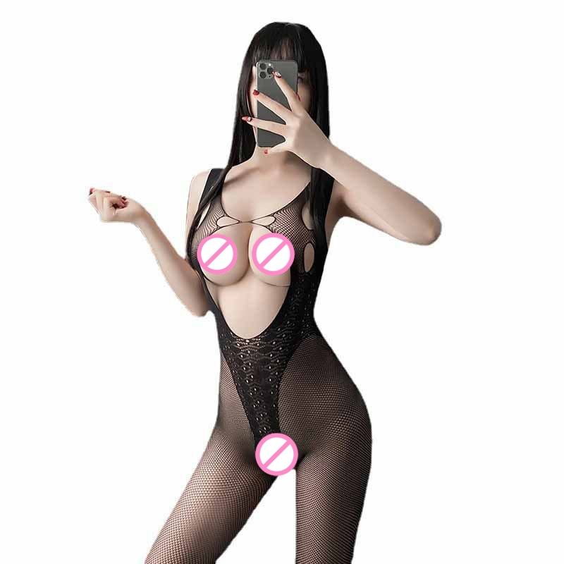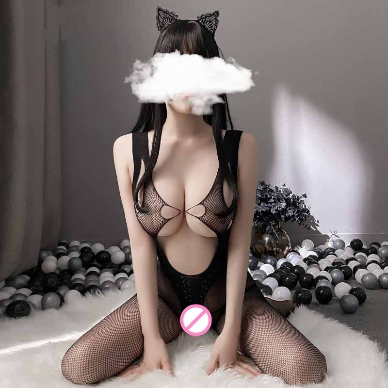 ชุดชั้นในเซ็กซี่สไตล์เอเชียสำหรับผู้หญิง ชุดบอดี้สูทตาข่ายซีทรูโชว์หน้าอก ถุงน่องไหมเนื้อแน่นแบบฉีกขาดได้