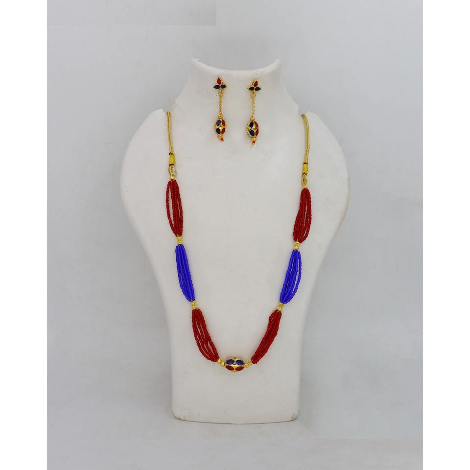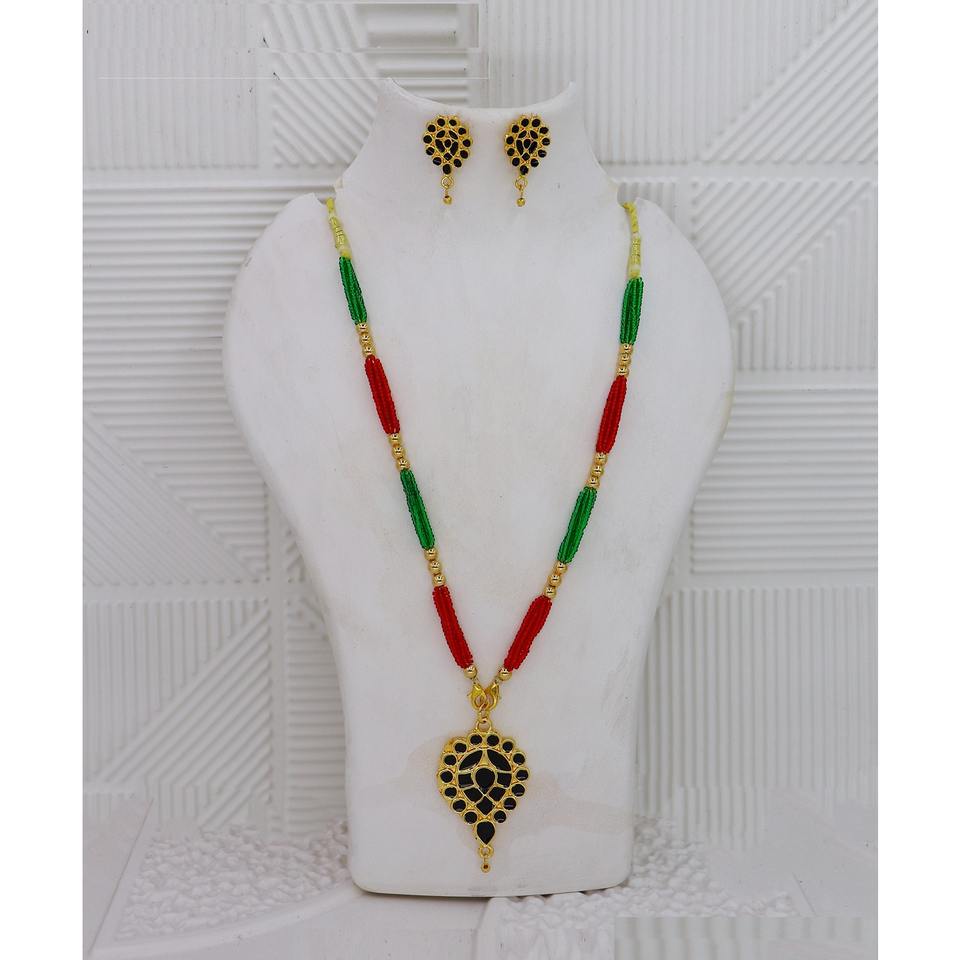 ชุดสร้อยคอประดับลูกปัดสีแดงเขียวแบบดั้งเดิมของชาวอัสสัมสำหรับผู้หญิง ทำด้วยมือ เครื่องประดับงานเทศกาล สร้อยคอประดับลูกปัดสไตล์ชาติพันธุ์ พร้อมต่างหู